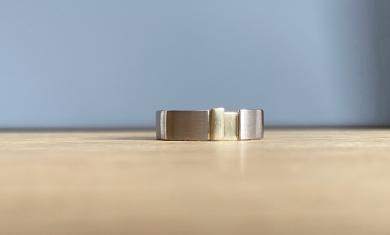 Zwei goldene Trauringe wurden in einen neuen Weißgoldring so eingearbeitet, dass die Gravuren innen noch erkennbar sind. Den goldenen Steg oben fertigten wir aus dem dritten Ring. An diesem Beispiel sieht man sehr schön, wie aus mehreren Erinnerungsstücken ein neuer, schlichter Ring entstanden ist.